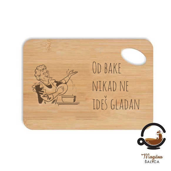Personalizirana daska za rezanje s gravurom “Od bake nikad ne ideš gladan” savršen je poklon za ljubitelje kuhanja i obiteljskih okupljanja. Izrađena od visokokvalitetnog drva, daska je idealna za pripremu i serviranje hrane, dodajući toplinu i karakter svakoj kuhinji.