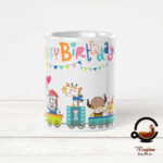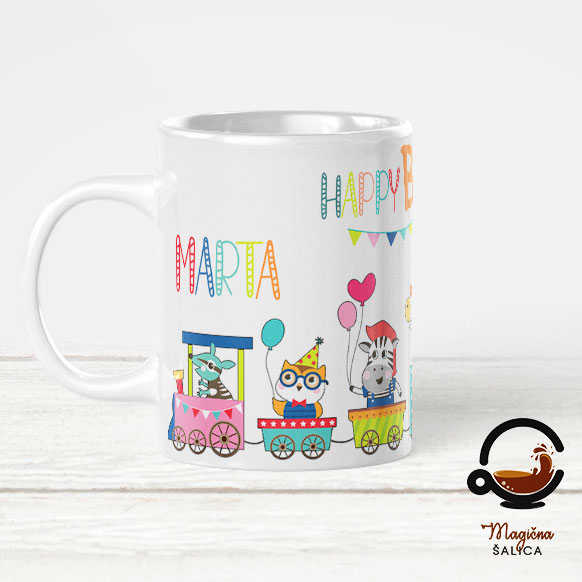 Šalica na sebi ima aplikaciju slike životinja s natpisom “Happy birthday” i moguće ju je personalizirati osobnim imenom.