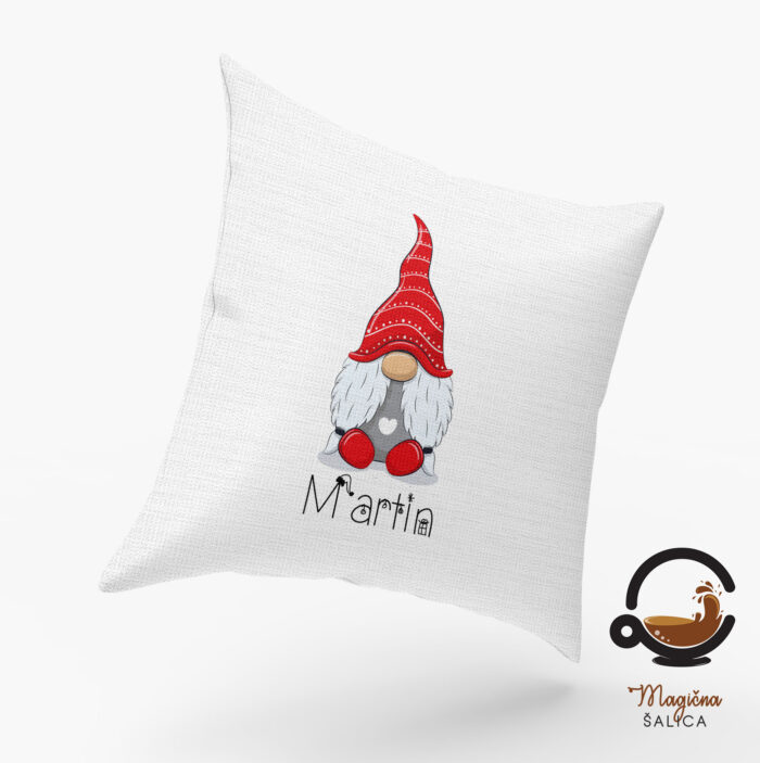 Jastuk na sebi ima apliciran Božićni Patuljak i moguće ga je personalizirati.