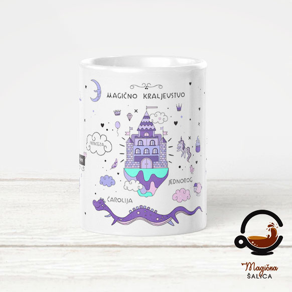 Šalica Magično Kraljevstvo zapremnine 3 dcl, s velikom ručkom sa strane, postat će tvoja najdraža šalica za ispijanje čaja, kave, soka i svih ostalih tebi dragih tekućina.
