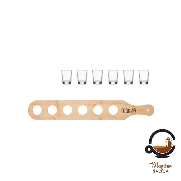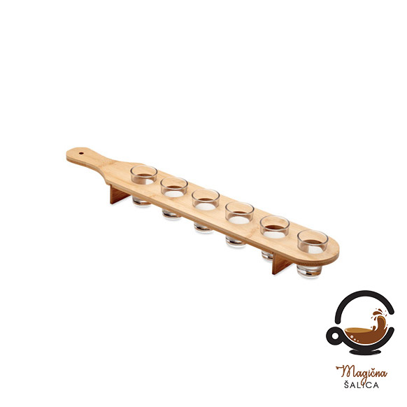 Set od 6 čaša za posluživanje na bambusovom podlošku je savršen dodatak vašem stolu. Svaka čaša ima kapacitet od 20 ml, idealna za serviranje aperitiva ili drugih pića na poseban način.