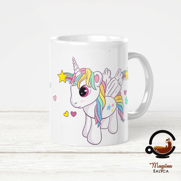 Šalica na sebi ima aplikaciju jednoroga i moguće ju je personalizirati osobnim imenom.