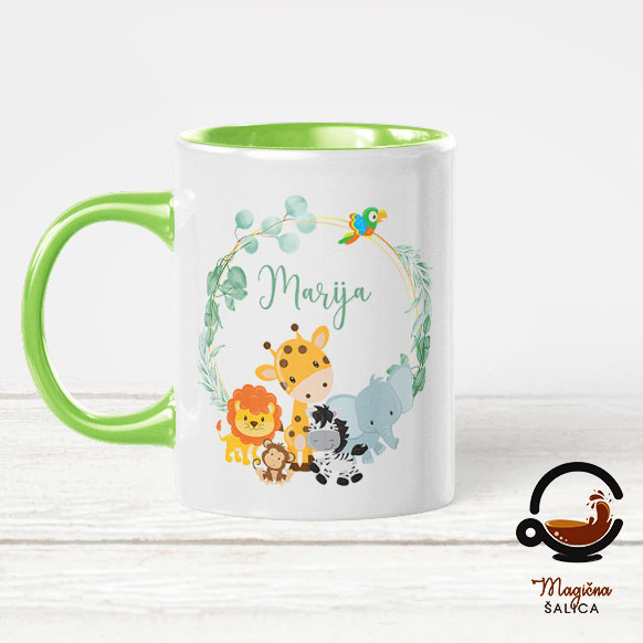 Šalica na sebi ima aplikaciju slike životinja i moguće ju je personalizirati osobnim imenom.