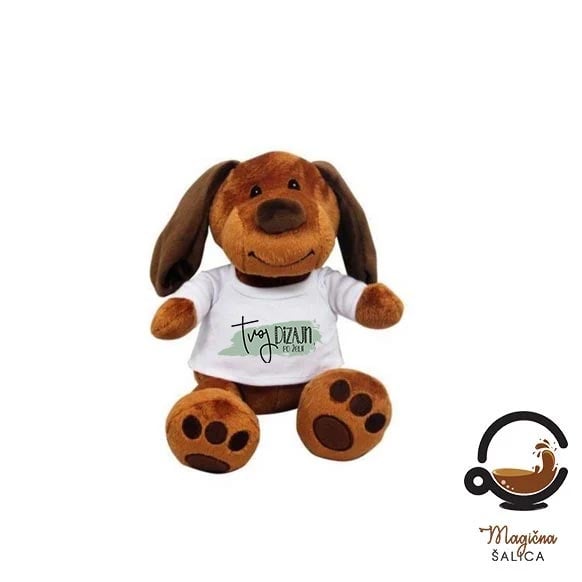 Upoznaj svog novog mekanog prijatelja – personalizirani plišani pas s majicom na kojoj možeš imati svoj dizajn! Možeš dodati slike, tekst ili neku posebnu poruku koja ti puno znači. Bilo da je ovo dar za nekoga posebnog ili poklon samom sebi, ovaj plišani pas bit će savršena uspomena i donijet će osmijeh svaki put kad ga pogledaš.