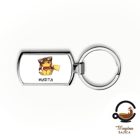 Metalni privjesak na ima sebi aplikaciju s Pikachu i tvojim imenom.