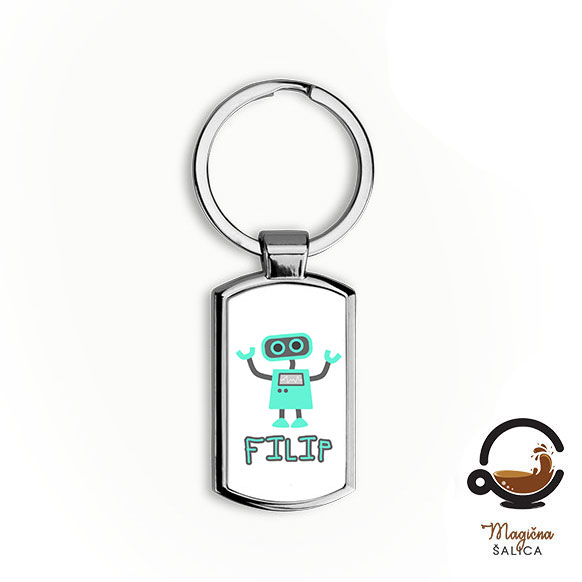 Metalni privjesak na ima sebi aplikaciju s Robotom i tvojim imenom.