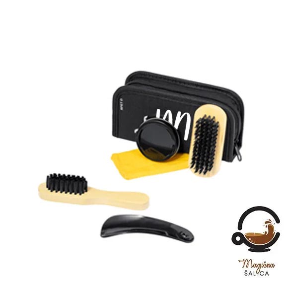 Set za održavanje cipela sadrži sve što je potrebno za besprijekorno čiste i uredne cipele – kremu za čišćenje, praktičnu žlicu za obuvanje, mekanu krpicu i dvije četke različitih veličina. Sve je pažljivo složeno u elegantnu torbicu, spremno za poklon koji spaja korisnost i stil.