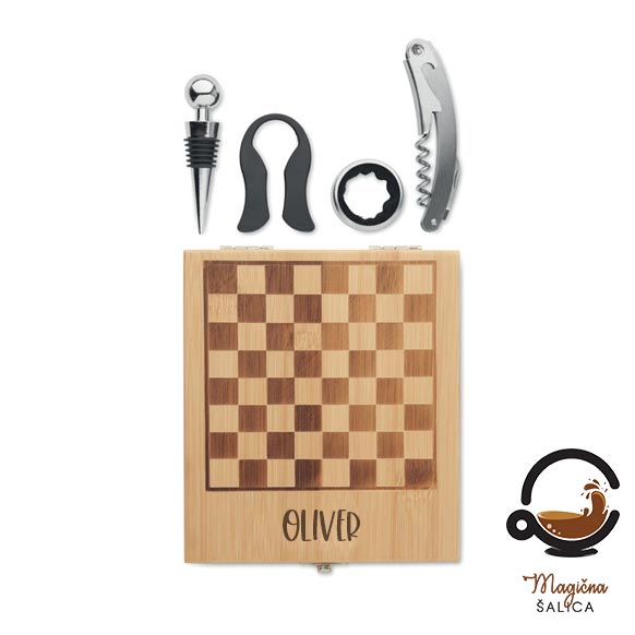 Set uključuje visokokvalitetnu vinsku opremu i klasičnu šahovsku ploču, a sve može biti personalizirano imenom, inicijalima ili posebnom porukom. Savršen je za posebne prigode poput vjenčanja, rođendana ili obljetnica, stvarajući nezaboravne uspomene koje će trajati.