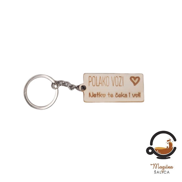 Drveni privjesak na ima sebi aplikaciju s natpisom Polako vozi, netko te čeka i voli.