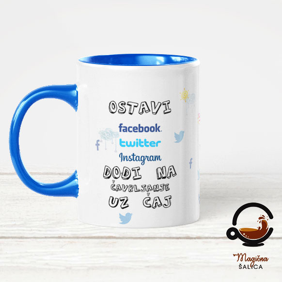 Šalica na sebi ima aplicirani natpis: „Ostavi Facebook, Twitter i Instagram. Dođi na čavrljanje uz čaj“.