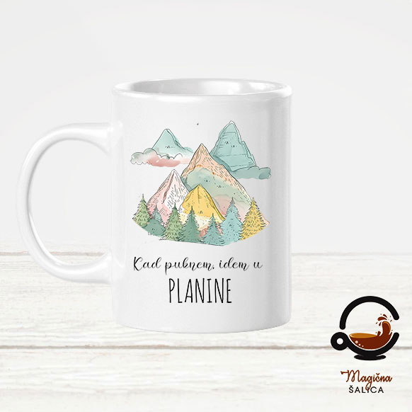 S natpisom “Kad puknem, idem u planine”, šalica šalje jasnu poruku – vrijeme je za pauzu i povratak prirodi! Idealna je za sve koji sanjaju o vikendu u planinama dok su na poslu ili za one koji traže savršen poklon za prijatelja koji voli planinarenje.