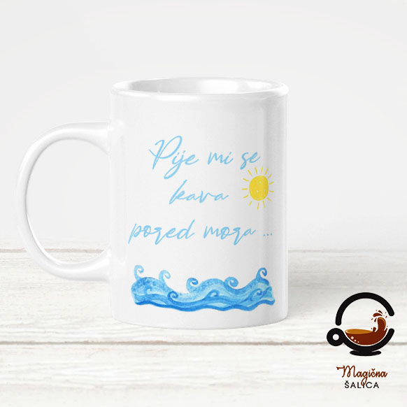 Šalica na sebi ima aplikaciju s natpisom “Pije mi se kava pored mora“.