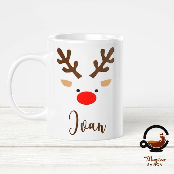 Šalica na sebi ima aplikaciju lica Rudolpha i moguće ju je personalizirati osobnim imenom.