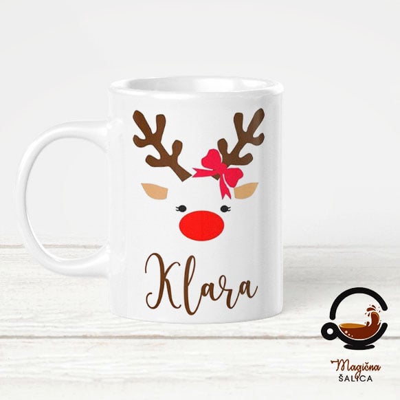 Šalica na sebi ima aplikaciju lica Rudolpha i moguće ju je personalizirati osobnim imenom.