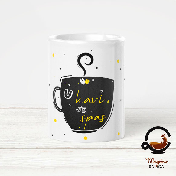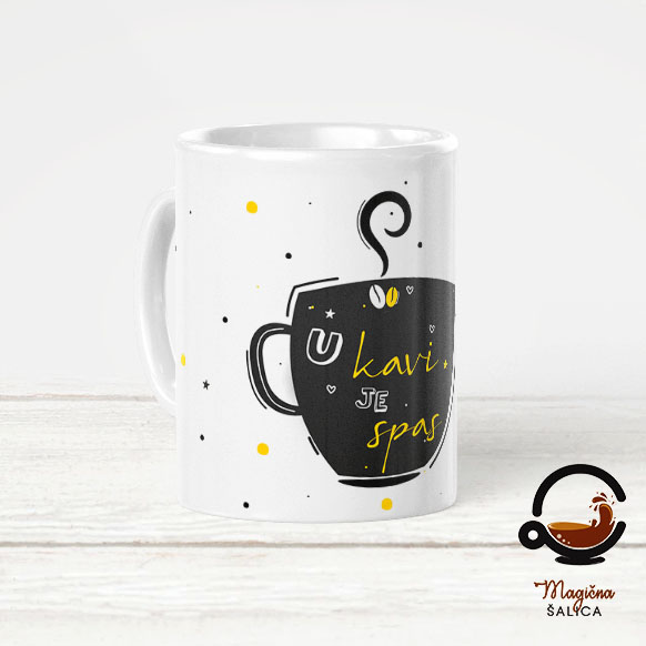Šalica na sebi ima aplikaciju s natpisom “U kavi je spas“.