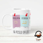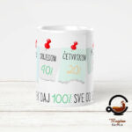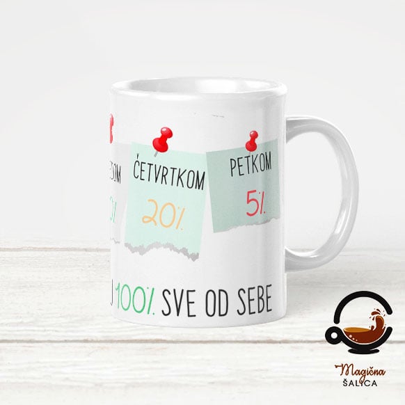 Šalica na sebi ima aplicirani natpis: „Na poslu uvijek daj 100% sve od sebe“.