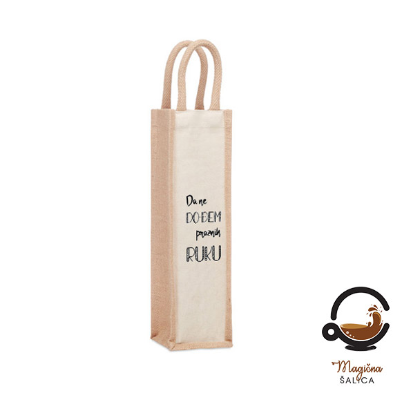 Vrećica za vino od jute s fora natpisom “Da ne dođem praznih ruku” je idealno rješenje! Izrađena od visokokvalitetne jute, ova vrećica ne samo da štiti bocu vina, već i dodaje dozu šarma i humorističnosti tvojim poklonu.
